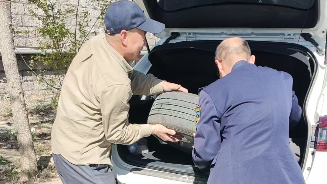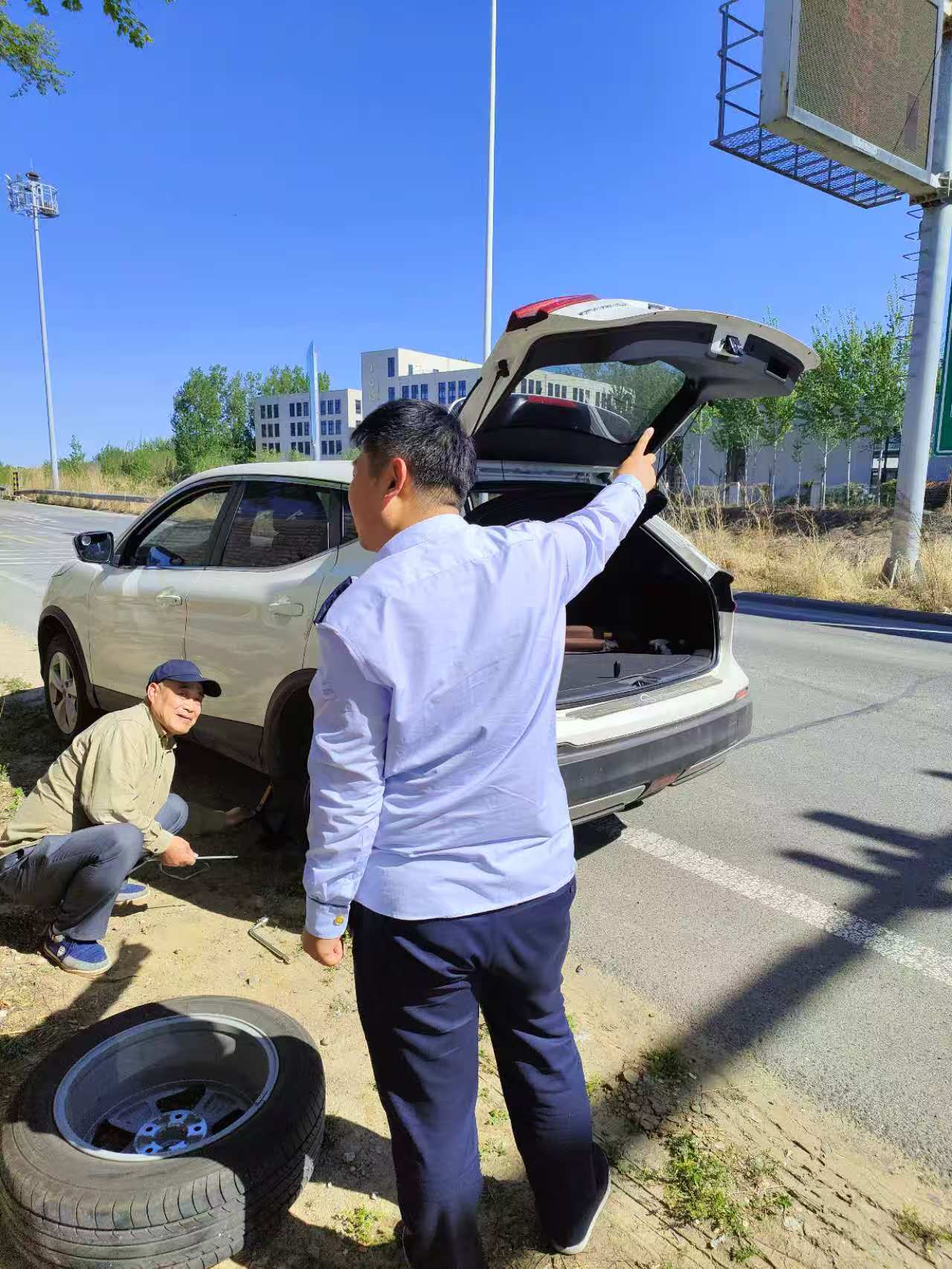 4月24日下午3时许,齐心庄收费站入口广场处,一辆白色SUV车辆因右前轮爆胎滞留在车道旁。当班人员发现后,立即上前询问情况。得知司机王先生因缺乏换胎经验手足无措,工作人员迅速设置安全警示区,取出便民服务箱工具,顶着烈日俯身操作。仅用15分钟便娴熟完成备胎更换,还贴心叮嘱王先生备胎时速限制。
