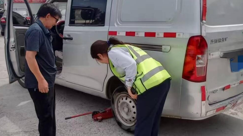 6月9日上午10时左右,一辆小型货车突然停靠在香河西收费站外广场,司机焦急地向正在疏导车辆的班长挥手求助。经询问得知,车辆行驶途中左后轮亏气严重,司机因缺乏换胎经验,只能将车停在路边,到收费站寻求帮助。