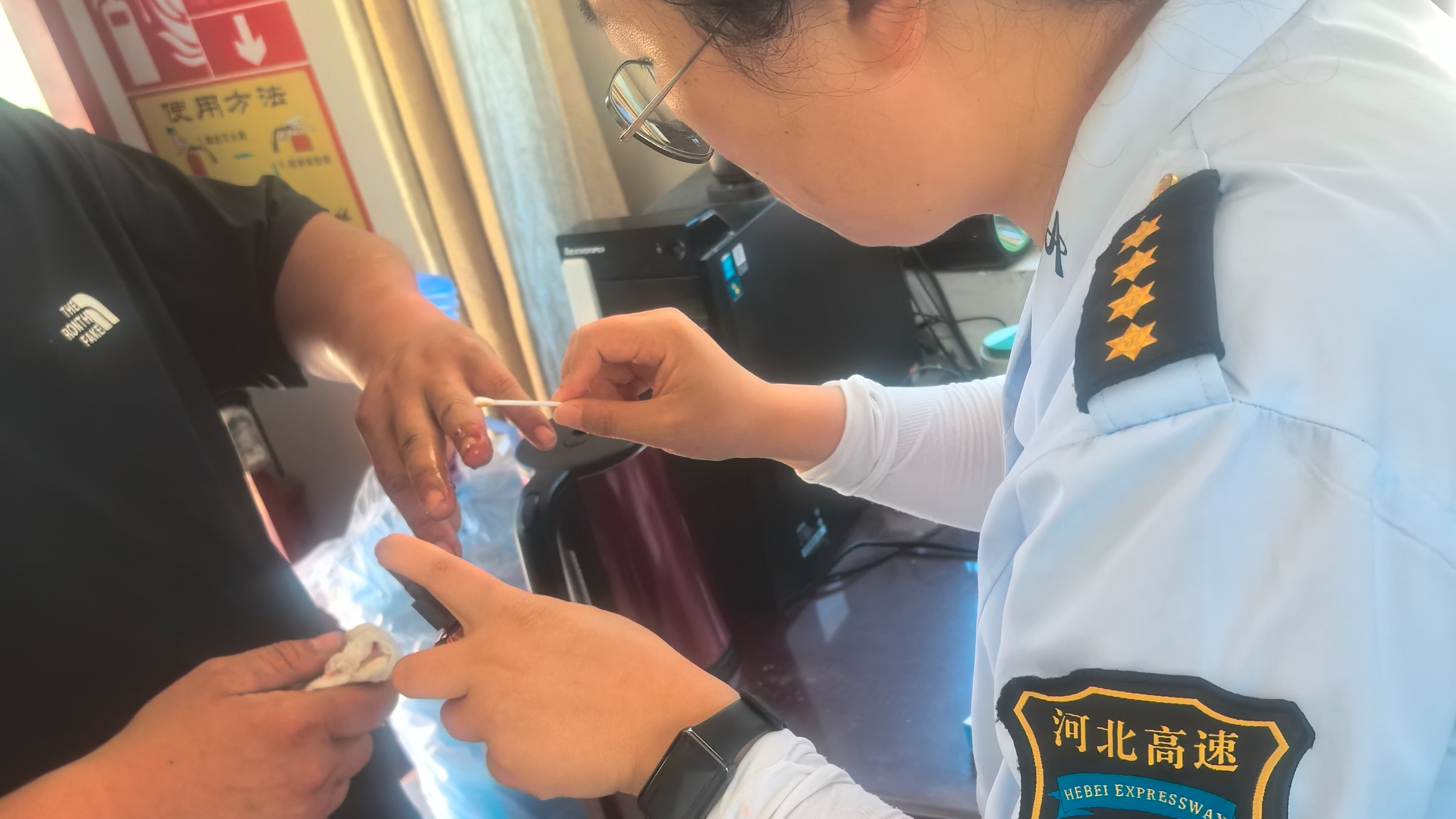 6月12日17时许,一辆“绿通”车辆在香河西收费站出口车道完成核验后,司机关闭车厢门时,不慎划破手指,鲜血瞬间流出。班长立即上前,邀请司机前往值班室,为其清理伤口。
