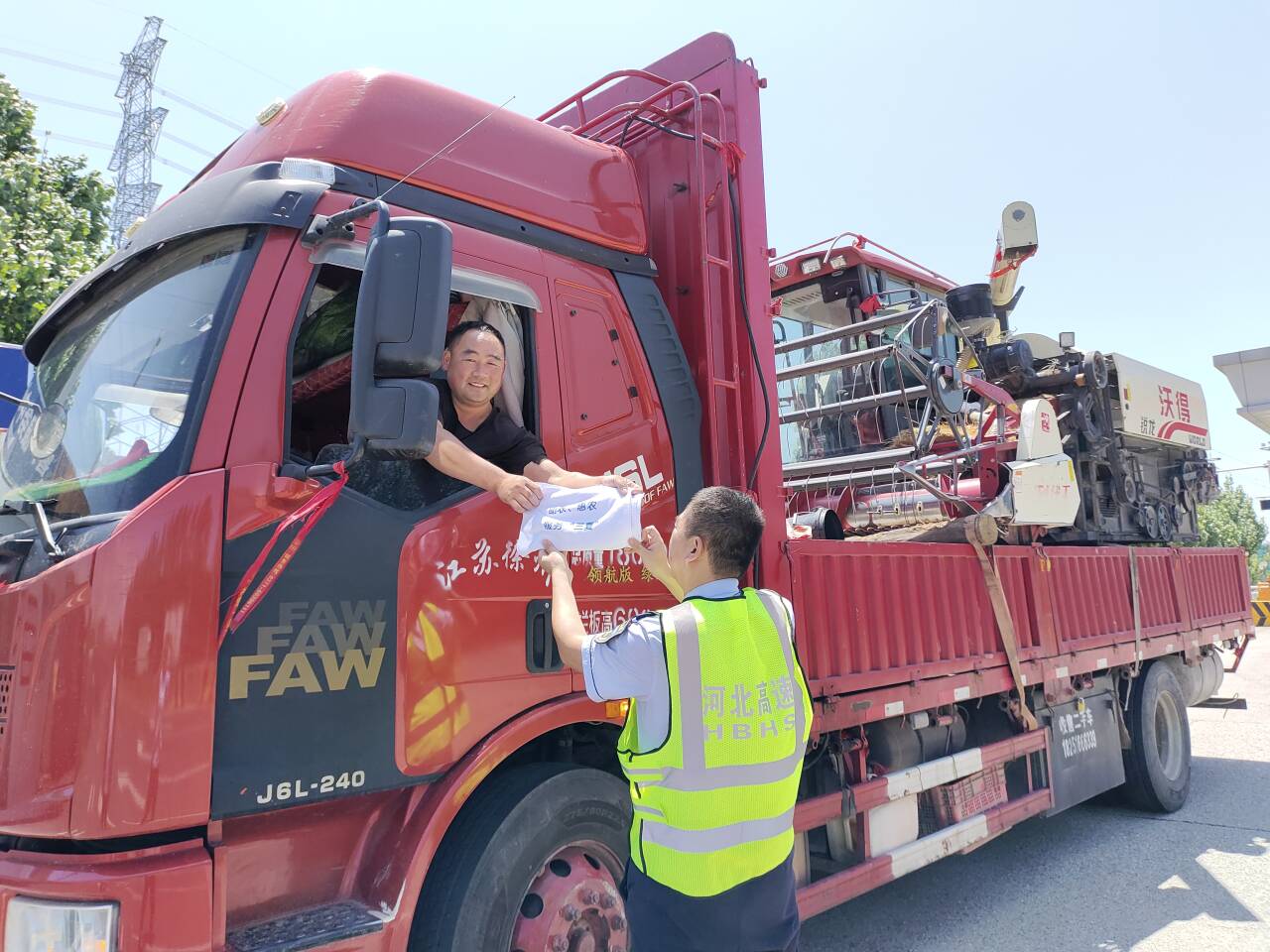 暖心服务驿站,传递关怀与温度。设立“三夏”服务台,为农机手们提供矿泉水、方便面、热水、《联合收割机运输车辆免费通行指南》,还准备了藿香正气水、修车工具、草帽、毛巾、手套等物资。此外,工作人员主动与农机手沟通交流,详细了解他们的需求和困难,为其提供周边路况、加油站、维修点等信息咨询服务,帮助解决实际问题。贴心的服务,让农机手们在奔波途中感受到家一般的温暖。