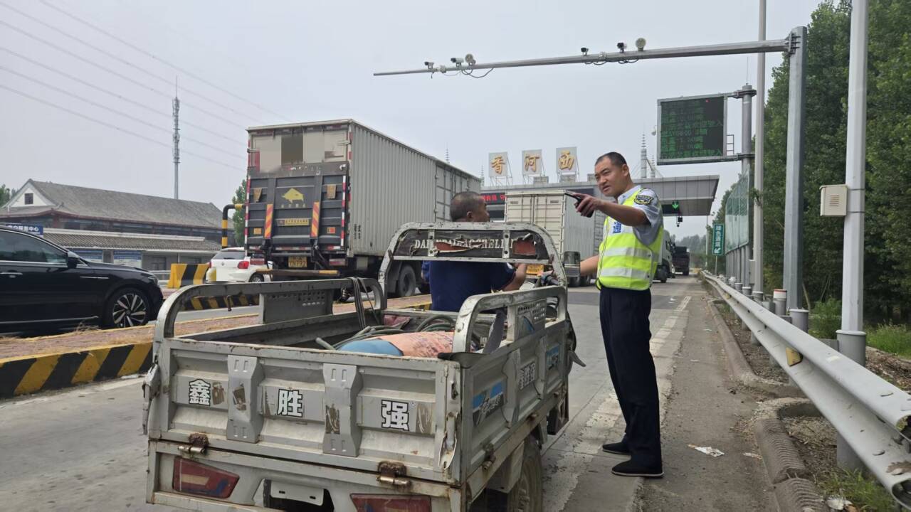 7月25日18时许,一位老人驾驶电动三轮车沿入口车道缓缓向香河西收费站驶来,身旁货车、轿车呼啸而过,老人却浑然不觉危险,还在试图继续向前行驶,正在附近疏导车流的班长发现该情况后,快步上前拦住三轮车。
