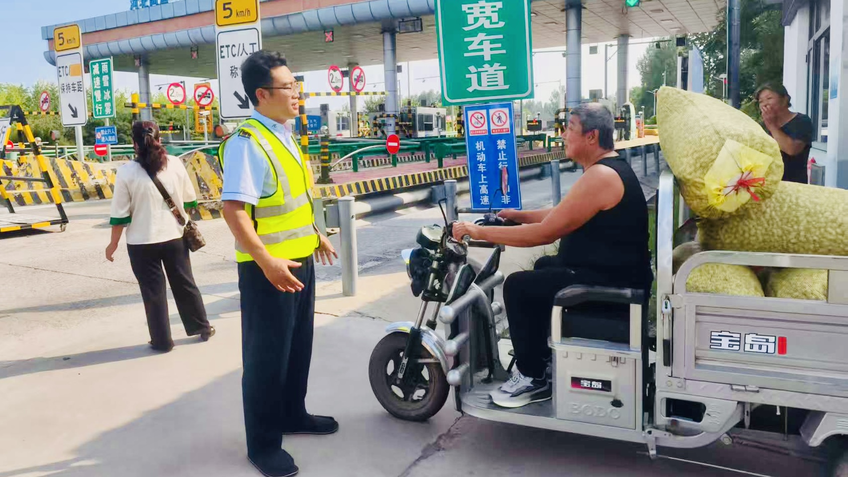 原来老人是附近村民,想“抄近路”回家。工作人员把他请到便民服务亭,递上矿泉水,耐心说明行人、非机动车上高速的危险,又拿《道路交通安全法》条文逐句解释,老人了解后调转车头离开。