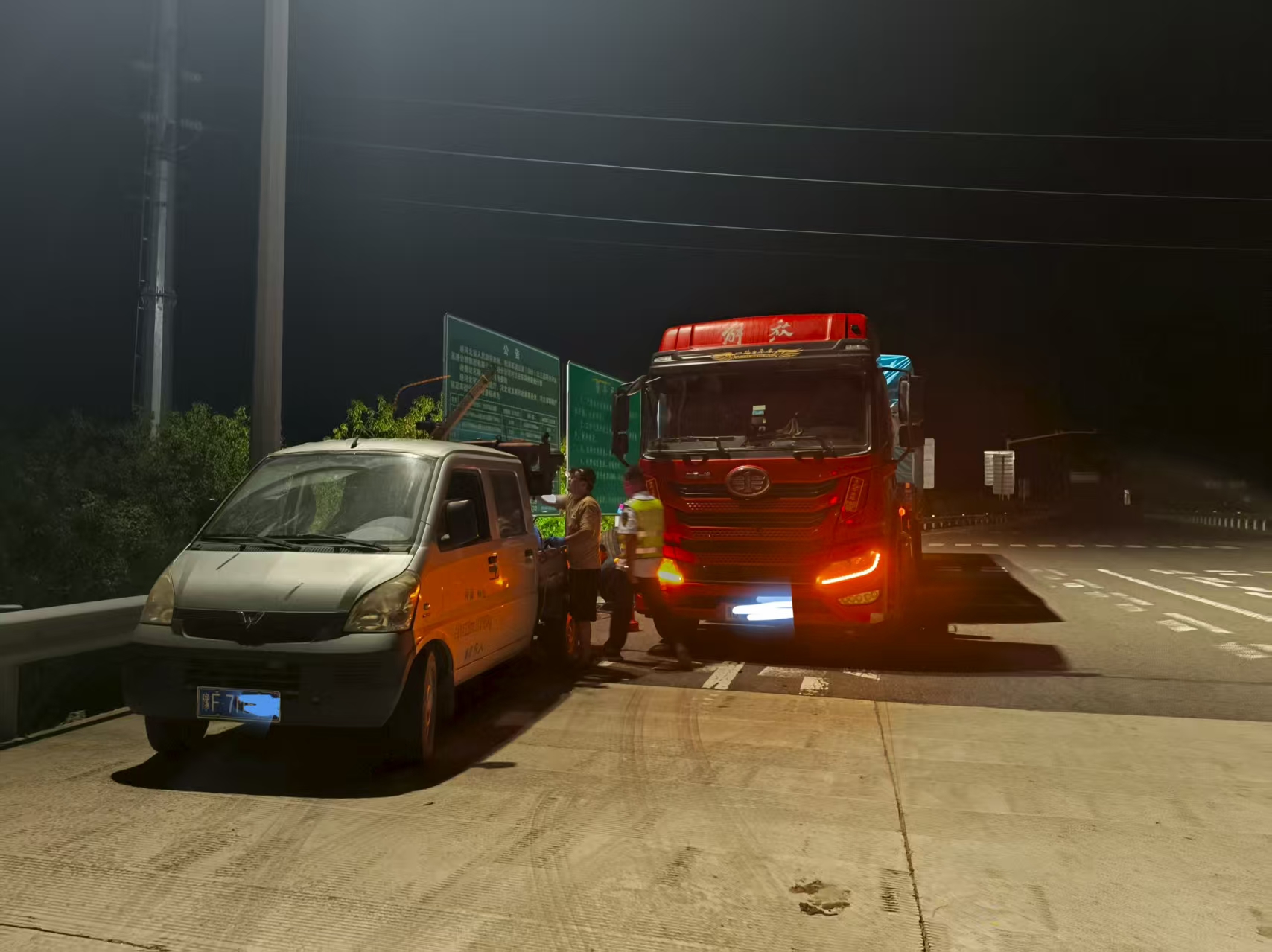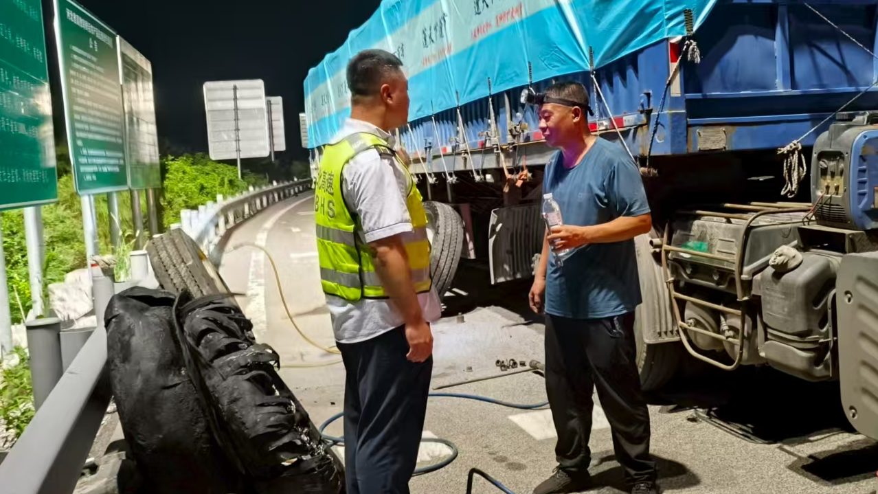 9月5日凌晨1时许,夜色深沉,一辆开启双闪警示灯的六轴货车缓缓停靠在三河南收费站出口广场。司机神色慌张地奔向收费窗口,说明车辆临近出口时两条轮胎同时爆胎,既无法继续行驶,又不熟悉周边修理厂位置,急需站区帮助。