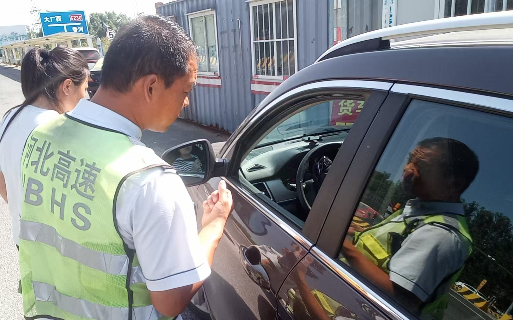 9月7日上午,香河西收费站收费班长闫春雨在执行日常巡查时,发现一名司机将车辆停于外广场安全区域,正焦急地操作手机导航。当时站口车流逐步增加,为确保车道畅通和人员安全,立即上前询问。