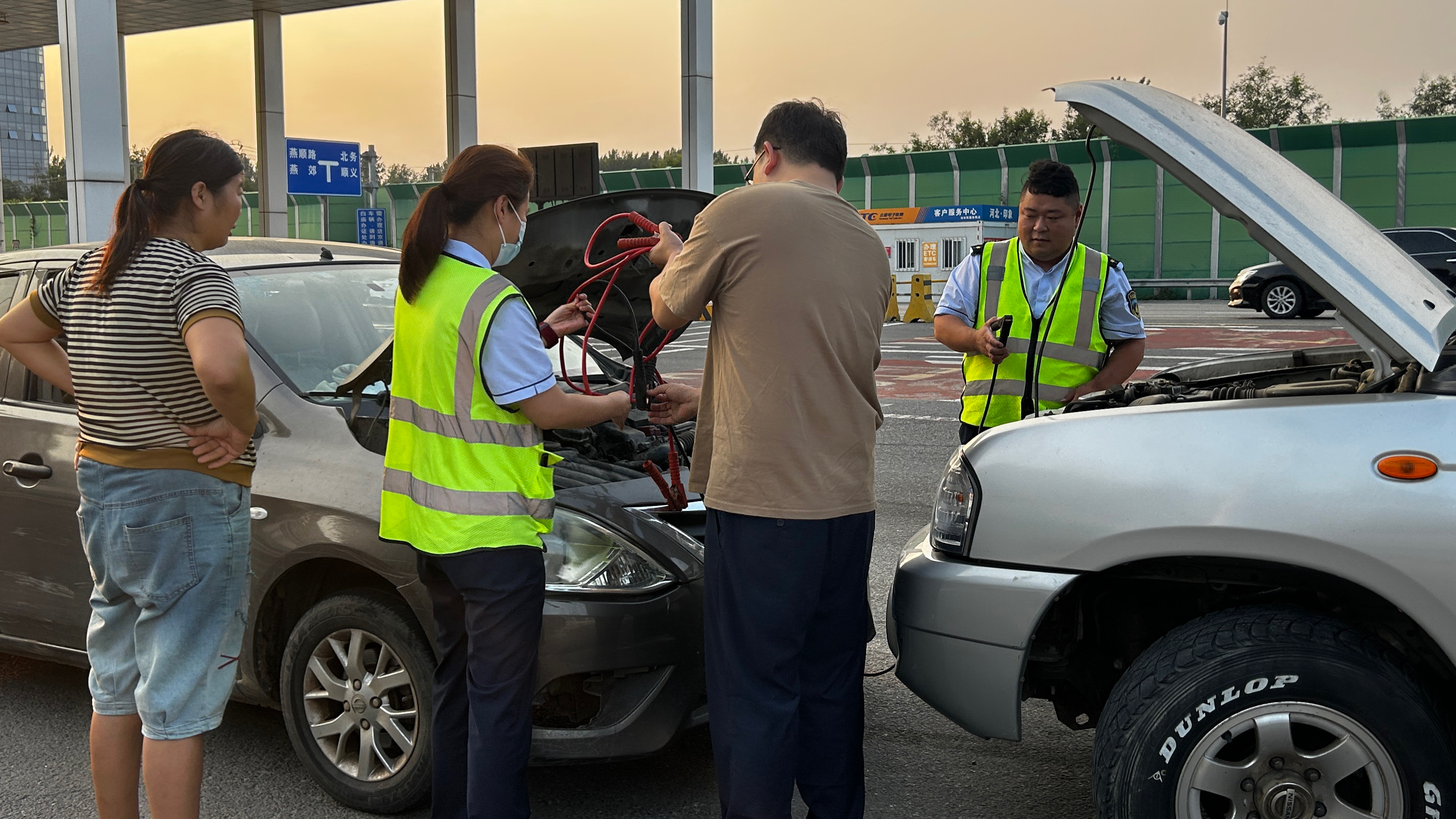 9月14日,在燕郊西收费站入口广场上,一辆小型轿车因电瓶电量耗尽突然熄火,无法继续行驶。司机面对突发状况焦急万分。恰在此时,正在附近巡逻的疏导员发现异常,迅速上前询问情况,并第一时间将故障信息报告给当班班长。