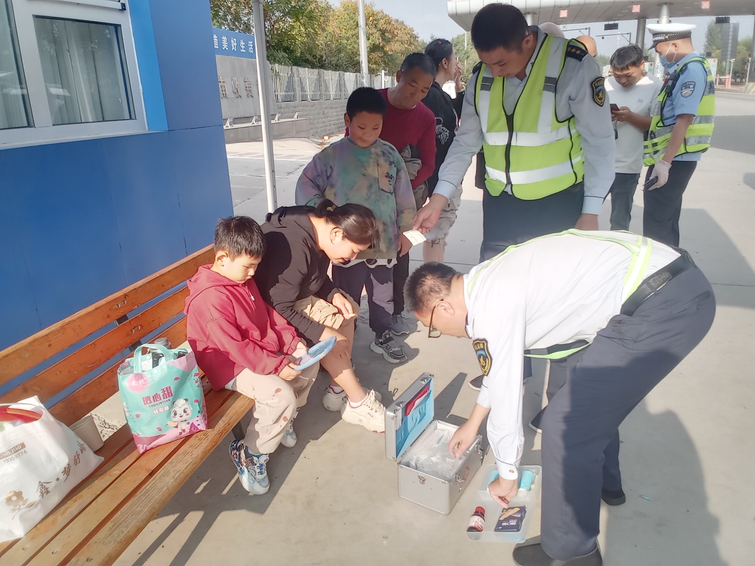 10月3日下午3时,一辆小型轿车停在固安南收费站站口,车上下来一家五口,收费班长上前询问得知车辆在高速路上遇到交通事故,一位女士膝盖剐蹭受伤。班长一边安慰她,一边迅速取来便民服务亭内常备的医用药箱,并与同事一起协助处理伤口,先用生理盐水冲洗伤口,再用碘伏仔细消毒,最后以无菌纱布层层包扎固定,整个处置过程规范利落。包扎间隙,工作人员递上热水安抚女子,并提醒其伤口避免碰水。一家人再三向工作人员表示感谢。