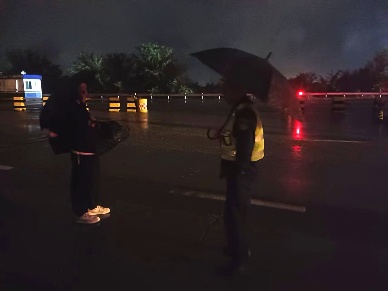 10月10日20时40分左右,夜色渐浓,雨丝纷飞。一名身着黑色冲锋衣、身背黑色双肩包的行人,手持黑伞步入蒋福山收费站收费外广场。正在广场巡查的收费班长第一时间发现这一情况,立即快步上前,一边示意过往车辆减速避让,一边将行人引导至安全区域。经耐心询问得知,该行人在寻找与朋友的约定地点时走错路线,误闯至收费广场。当时广场地面因降雨湿滑难行,加之夜间光线较暗,过往车辆穿梭不断,行人的安全处境十分危险。为保障其安全并避雨,收费班长主动邀请行人进入便民服务室休息,并递上热水为其驱寒。待雨势渐歇、路面条件趋于安全后,收费班长又仔细为行人指明正确路线,目送其安全离开。