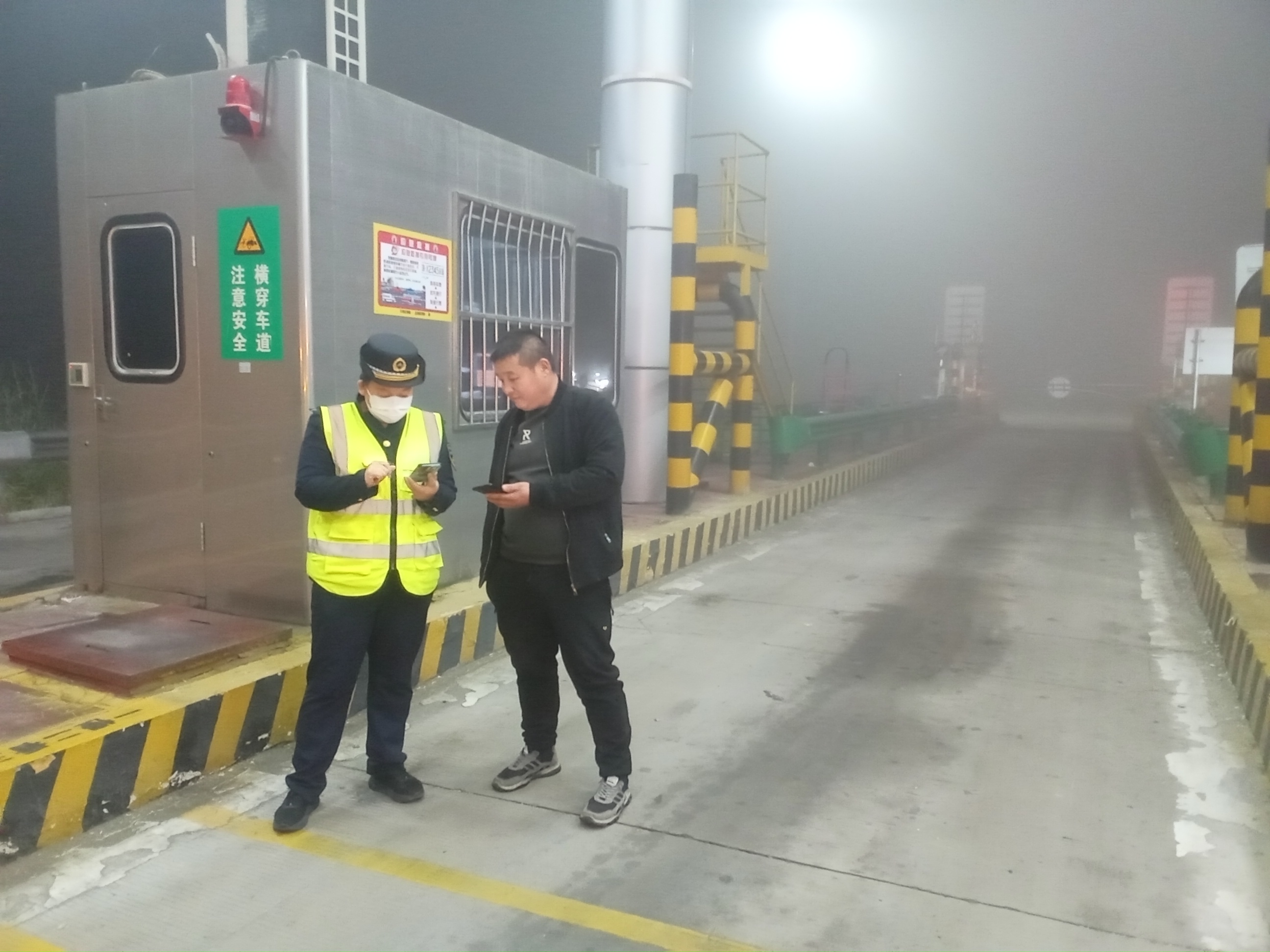 10月29日凌晨,大雾弥漫,正值收费二班夜班期间,一辆满载货物的厢式货车在浓雾中缓缓驶入收费广场,停靠收费窗口后,司机向收费员说明车辆为绿通运输车辆,收费员呼叫验货员前来验货。