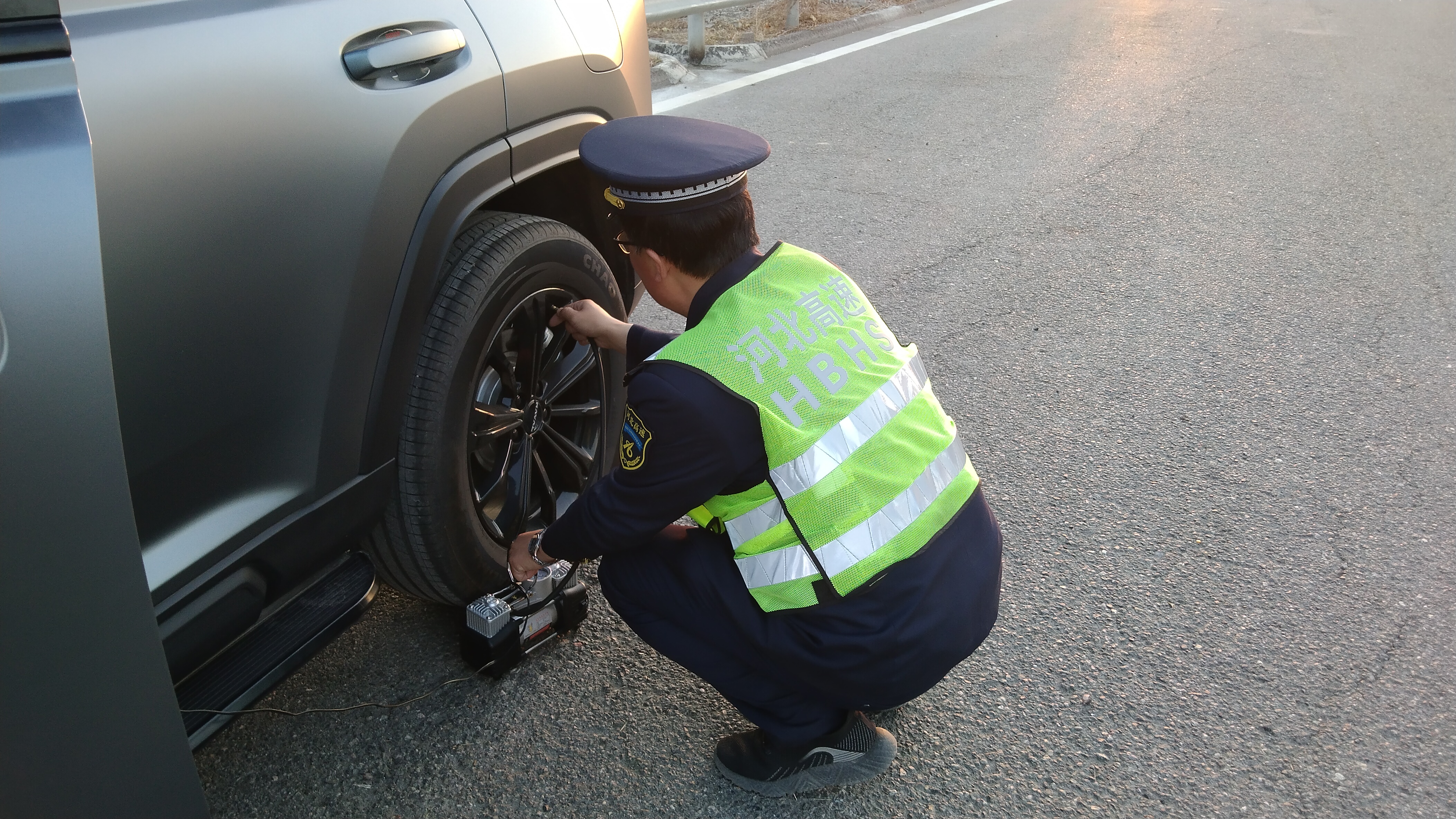 “师傅,您的左后轮胎胎压明显不足,继续开下去太危险了!”11月23日傍晚5点,暮色渐浓,廊坊分公司蒋福山收费站的出口车道上,收费员在完成缴费流程后,及时向正要驶离的小客车司机发出提醒。司机闻言先是一愣,匆忙推开车门查看,只见左后轮胎已然瘪了大半,原本就焦急的神色瞬间布满愁云:“这可怎么办!家里孩子正生病,我急着赶回去呢!” 看着司机手足无措的模样,收费员立刻放下手中的工作安抚道:“您别慌,咱们站里常备应急工具,我来帮您处理!” 一边稳住司机情绪,收费员一边指引车辆缓缓驶入安全区域,同时第一时间向班长上报情况。接到消息后,班长火速赶往便民服务室,取出便携式打气泵直奔车辆旁。熟练地连接好气门嘴后,他一边紧盯胎压表精准调节气压,一边不忘叮嘱司机:“您往后退一点,注意观察过往车辆,保持安全距离。” 随着打气泵的嗡鸣,瘪掉的轮胎渐渐恢复了饱满状态。即便如此,班长仍未松懈,又逐一检查了另外三个轮胎的胎压,确认所有轮胎状态正常后,才直起身擦了擦额头的薄汗。
