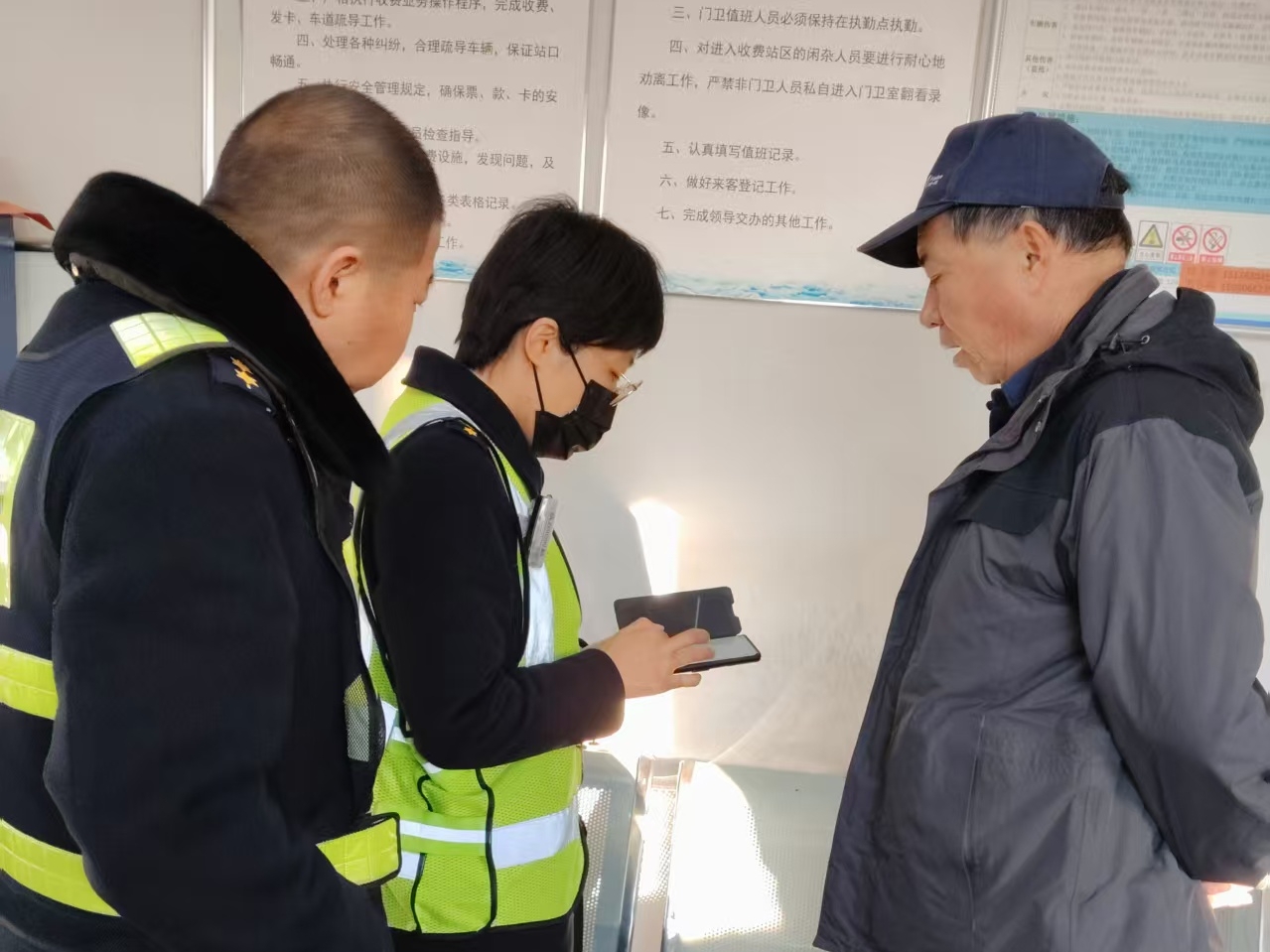 经了解,该司乘要前往北京,却对当地公共交通路线一无所知,眼看行程临近,一时没了头绪。收费班长一边安抚其情绪,一边快速查询最优乘车方案,告知他乘车点就在收费站附近,步行仅需几分钟。考虑到公交还要一段时间才到站,且户外天气偏冷,工作人员热情邀请司乘到站内门卫室休息等候,并递上热水。