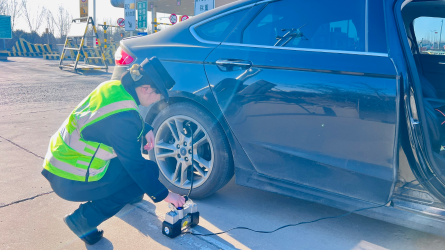 1月29日21时16分,一辆小型客车缴费完毕驶出收费车道后,缓缓停靠在收费广场路边。司机一脸焦急,下车查看发现后轮轮胎亏气严重,无法继续行驶。班长见状,快步走到车旁,关切地询问司机情况。[详细]