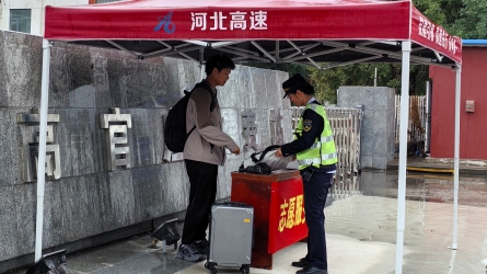 10月8日,国庆返程高峰遇上雨天,固安东收费站的疏导员像往常一样在广场执勤。他远远看到一名学生拖着行李,在高速口徘徊了很久。便主动上前询问是否需要帮助。[详细]
