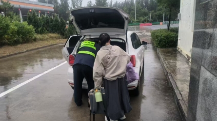 10月8日15时30分,高官庄收费站外广场上,一名大学生一手推行李箱、一手拎包,背着书包,在雨中独自撑伞前行。疏导员发现这一情况后,立即主动上前提供帮助。[详细]